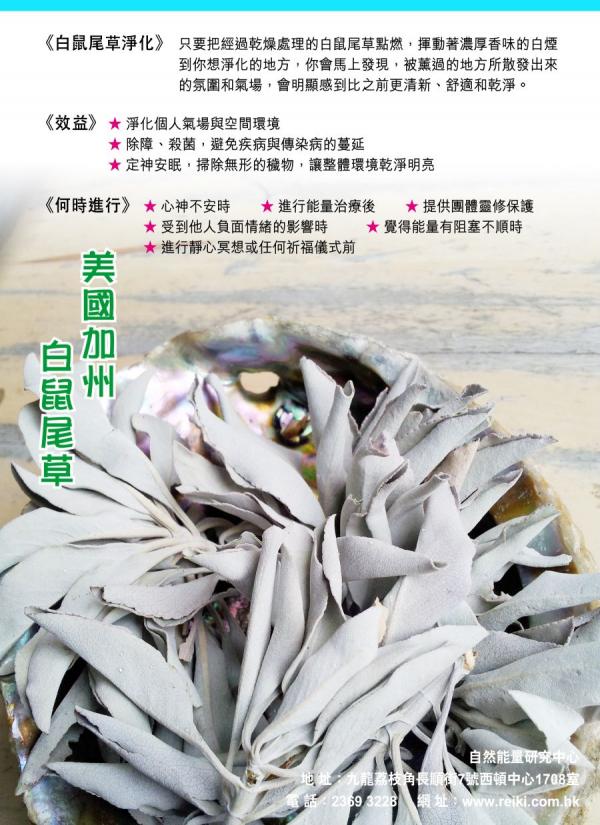將數枚白鼠尾草點燃一端後,將其火焰熄滅並放入容器內,讓產生的白煙自由地在空間中飄散並淨化環境、人或物品。使用此煙燻天然晶石大概十五至三十秒,就能達到淨化晶石的效果。想放鬆舒緩的話,也可以使用此香。