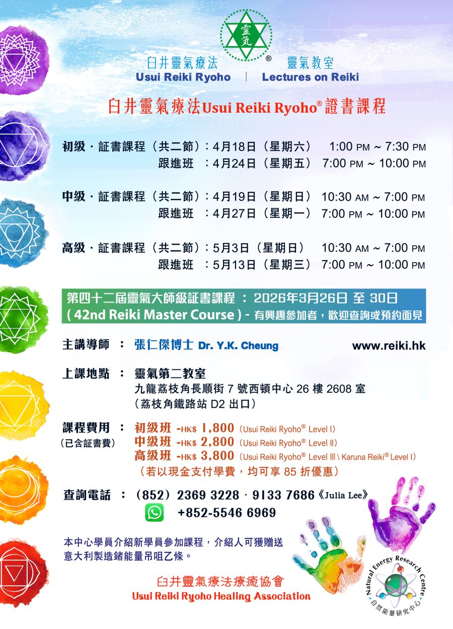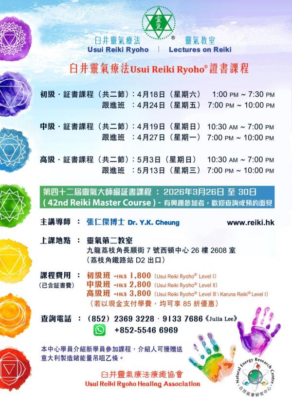 註:學員修畢後可獲國際靈氣訓練中心 (International Center for Reiki Training)